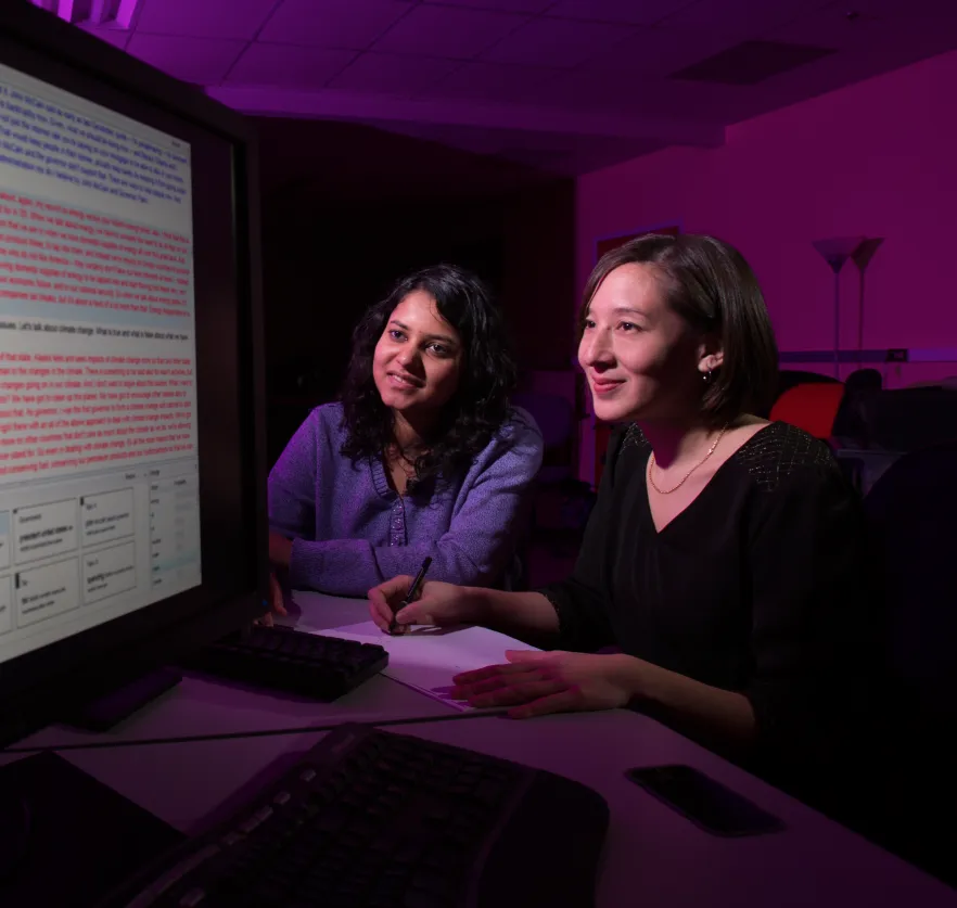 Marine Carpuat (on right in photo), an assistant professor of computer science with an appointment in UMIACS, and Yogarshi Vyas, a third-year doctoral student in computer science, received the Adam Kilgarriff Best Paper Award for their research on the semantic relationships between words.